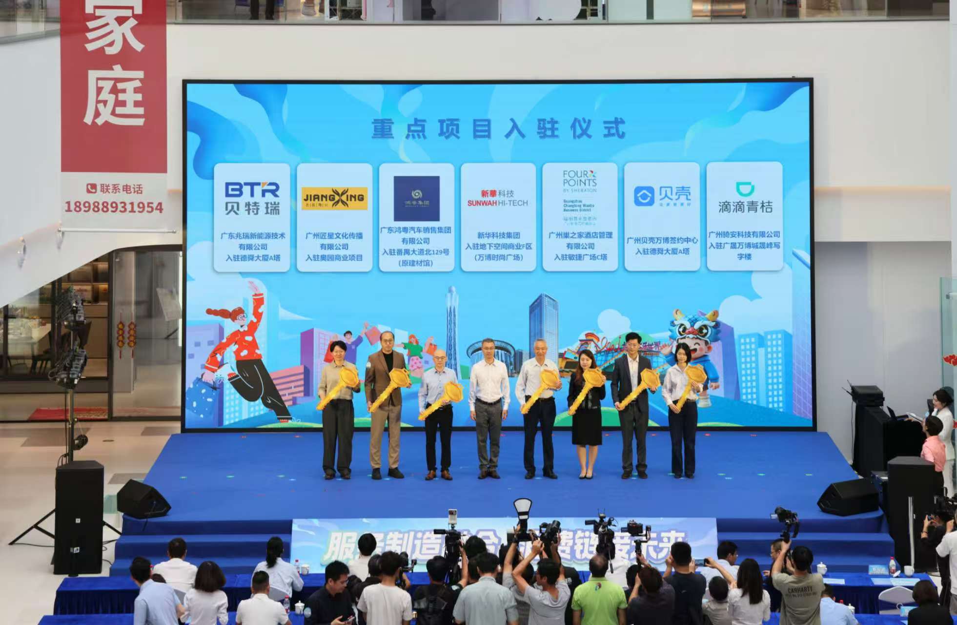 在重点项目入驻环节,新华科技集团、鸿粤汽车、巢之家、匠星文化、贝壳、兆瑞新能源、骑安等一批优质企业代表获颁象征入驻的“金钥匙”,正式加入长隆万博大家庭。